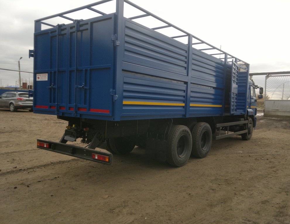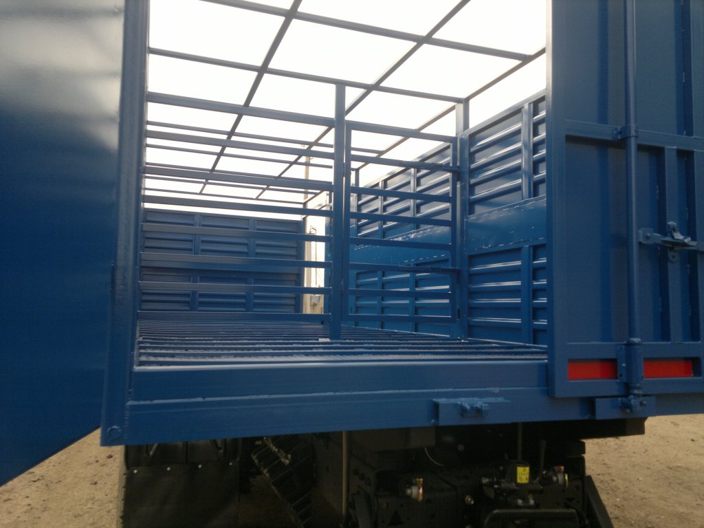 Пол железный рифленый лист, толщина 3мм. Верхняя часть надстройки закрывается накидным пологом с передними, боковыми клапанами для вентиляции кузова. Исполнение задней части: распашные ворота. Внешняя обшивка - крашеный лист, квадратная труба. Пространство внутри скотовоза разделено на помещения. Двери, перегородки изготовлены из металлической трубы. Материал для пола – рифленый стальной лист, смотровая дверь для персонала.