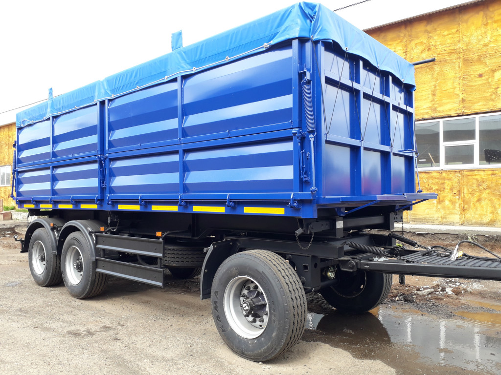 Самосвальная платформа. Верхний ряд боковых бортов с верхней навеской, нижний ряд боковых бортов подвижный с нижней навеской. 3 оси, 2 гидроцилиндра, 6 или т12 колес, 1 запасное